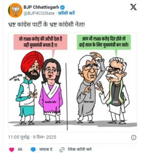 पोस्ट में दिख रहे कार्टून में भूपेश बघेल, टीएस सिंहदेव से कहते नजर आ रहे हैं—“आप भी 500 करोड़ रुपए देते तो ढाई साल मुख्यमंत्री बन जाते।” पोस्ट में भाजपा ने इसे कांग्रेस की अंदरूनी कलह और कथित भ्रष्टाचार का प्रमाण बताया है।