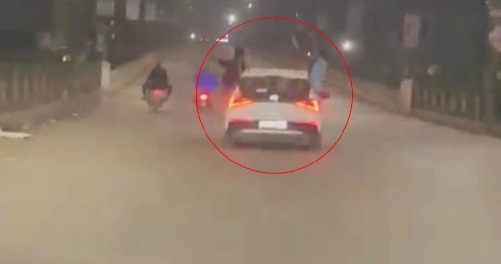 यह पूरा घटनाक्रम किसी राहगीर ने मोबाइल में कैद कर लिया, जो अब सोशल मीडिया पर तेजी से वायरल हो रहा है। वीडियो में साफ देखा जा सकता है कि कार की खिड़कियों से युवक बाहर झूलते हुए चिल्ला रहे हैं। किसी के हाथ में बोतल है तो कोई सीट से बाहर निकलकर हवा में झूल रहा है। वीडियो में कार की नंबर प्लेट भी दिखाई दे रही है, जिससे पुलिस को जांच में मदद मिल रही है।