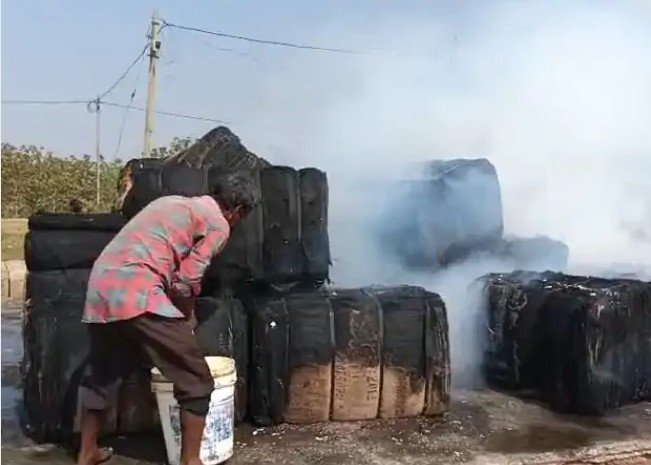 जांजगीर में धान खरीदी केंद्र में आग: 40 गठान बारदाना जलकर खाक, कारण अस्पष्ट