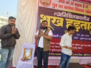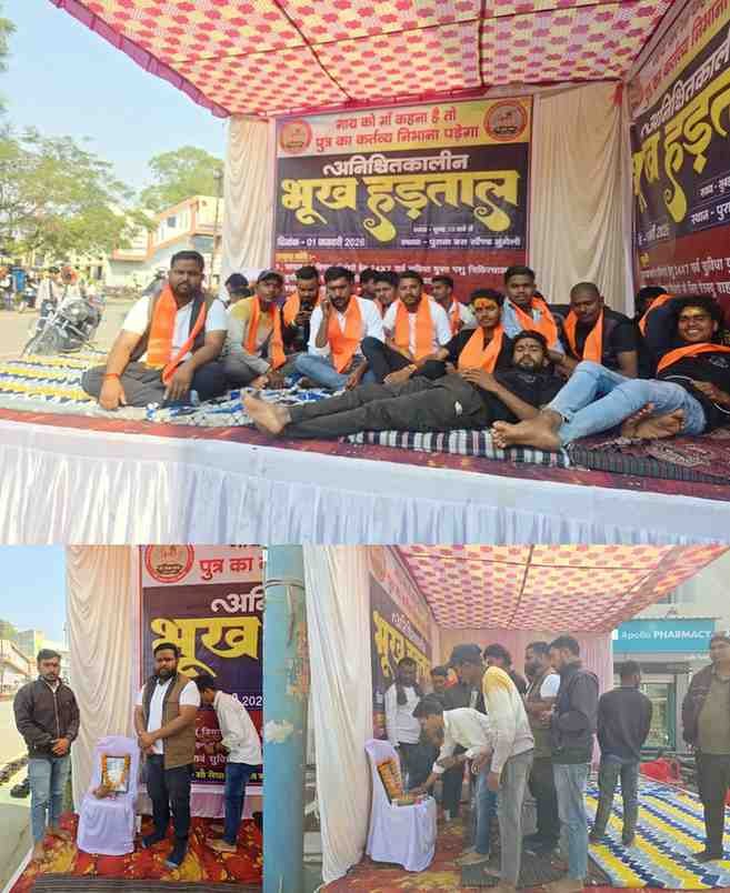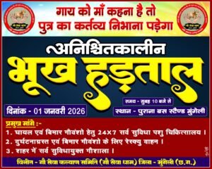 N.V.News मुंगेली: Hunger strike for cow protection: जिले में गौवंशों की बदहाल स्थिति और सरकारी उपेक्षा के खिलाफ बुधवार को गौ सेवा कल्याण समिति (गौ सेवा धाम) के तत्वावधान में अनिश्चितकालीन भूख हड़ताल (Hunger Strike) शुरू हो गई। यह भूख हड़ताल कांग्रेस पार्टी के अनुसूचित जाति जिला अध्यक्ष इंद्रजीत सिंह कुर्रे के नेतृत्व में पुराना बस स्टैंड, मुंगेली (Mungeli District) में सुबह 10 बजे से प्रारंभ हुई। आंदोलन में बड़ी संख्या में गौ सेवक और स्थानीय नागरिक शामिल हुए।