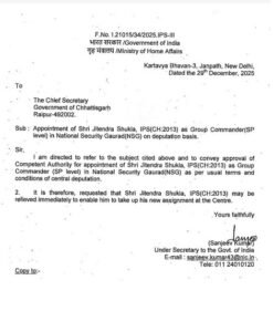 इस संबंध में केंद्रीय गृह मंत्रालय ने छत्तीसगढ़ सरकार को आधिकारिक पत्र भेज दिया है। पत्र में राज्य सरकार से आईपीएस शुक्ला को तत्काल प्रभाव से कार्यमुक्त करने का अनुरोध किया गया है, ताकि वे केंद्र में अपनी नई जिम्मेदारी संभाल सकें। यह पत्र भारत सरकार के अवर सचिव संजीव कुमार की ओर से जारी किया गया है।