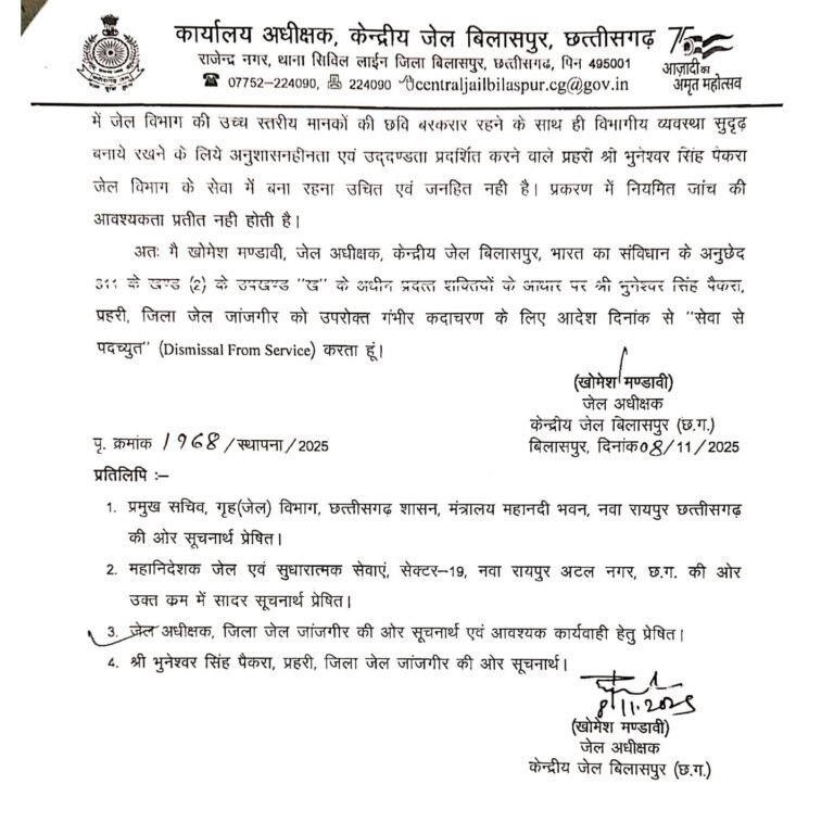 जिला जेल जांजगीर से फरार बंदी मामले में बड़ी कार्रवाई — लापरवाह जेल प्रहरी सेवा से बर्खास्त