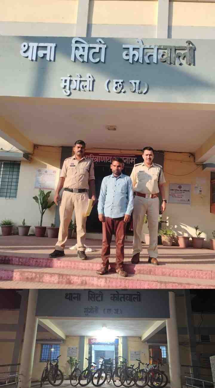 N.V.News मुंगेली: Bicycle thief arrested: जिला पुलिस (District Police) ने एक बार फिर साबित किया है कि अपराध चाहे छोटा हो या बड़ा, कानून की पकड़ से कोई नहीं बच सकता। पुलिस अधीक्षक भोजराम पटेल (भा.पु.से.)( SP Bhojraam Patel) के सख्त निर्देशन और प्रभावी निगरानी में सिटी कोतवाली पुलिस ने साइकिल चोरी (BiCycle Theft)के मामलों में बड़ी सफलता हासिल की है।