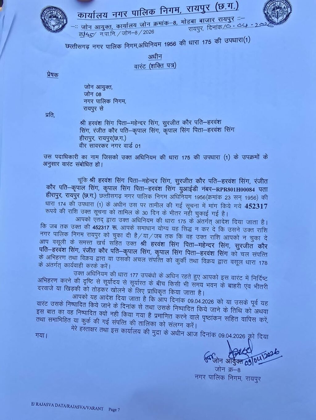 रायपुर। राजधानी में नगर पालिक निगम ने संपत्तिकर की वसूली के लिए अब सख्ती बरतना शुरू कर दिया है। निगम आयुक्त विश्वदीप के कड़े रुख के बाद जोन 8 की कमिश्नर श्रीमती राजेश्वरी पटेल ने वीर सावरकर नगर वार्ड क्रमांक 1 के बड़े बकायेदारों के खिलाफ मोर्चा खोल दिया है। निगम ने 5 लाख से अधिक की राशि जमा नहीं करने पर बकायेदार प्रीतम सिंह के खिलाफ सीलबंदी के बाद कुर्की वारंट जारी कर दिया है। इसके साथ ही कई अन्य रसूखदारों को भी भारी-भरकम बकाया राशि अदा करने के लिए अंतिम चेतावनी के तौर पर डिमांड नोटिस थमाए गए हैं।