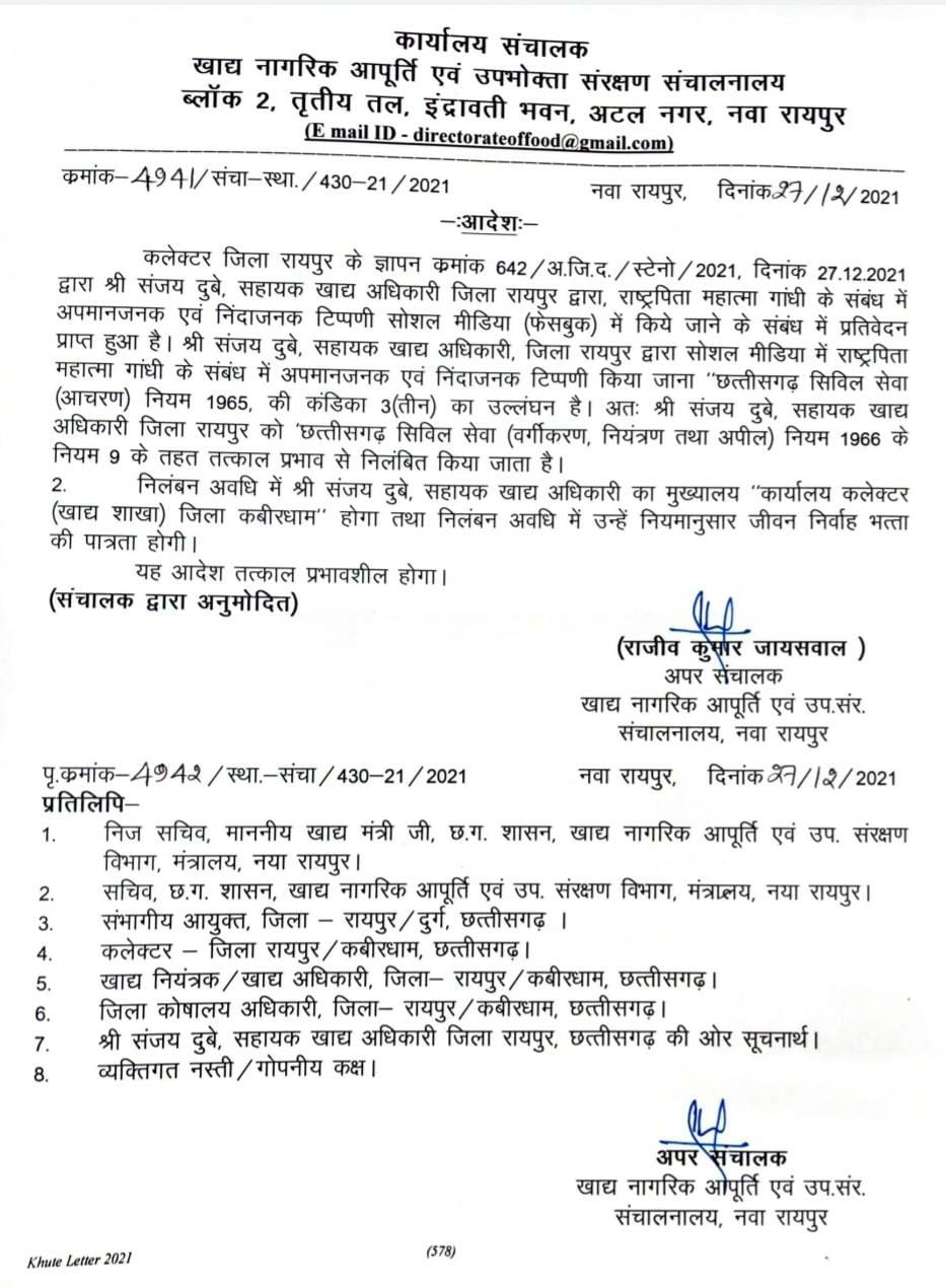 आदेश में लिखा गया है कि गांधी के खिलाफ कमेंट छत्तीसगढ़ सिविल सेवा आचरण के खिलाफ है, इसलिए दुबे को निलंबित किया जाता है। ये आदेश खाद्य विभाग के अपर संचालक राजीव कुमार जायसवाल के दफ्तर से जारी किया गया है।