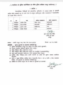 रायपुर। साल के अंतिम दिन जिला पुलिस प्रशासन में बड़ा प्रशासनिक फेरबदल किया गया है। एसएसपी रायपुर ने देर रात तबादलों के आदेश जारी करते हुए मैदानी इलाकों में पदस्थ 119 पुलिस अधिकारियों और कर्मचारियों का स्थानांतरण किया है। इस व्यापक फेरबदल को कानून-व्यवस्था को और अधिक मजबूत करने की दिशा में अहम कदम माना जा रहा है।