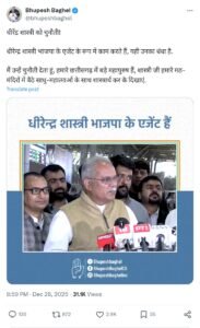 भूपेश बघेल ने सोशल मीडिया प्लेटफॉर्म ‘एक्स’ पर लगातार दो पोस्ट करते हुए लिखा कि धीरेंद्र शास्त्री भाजपा के एजेंट के रूप में काम करते हैं और यही उनका धंधा है। उन्होंने चुनौती देते हुए कहा कि छत्तीसगढ़ में कई बड़े महापुरुष और संत मौजूद हैं, यदि साहस हो तो शास्त्री जी यहां के मठ-मंदिरों में बैठे साधु-संतों के साथ शास्त्रार्थ कर के दिखाएं।