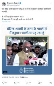 भूपेश बघेल ने सोशल मीडिया प्लेटफॉर्म ‘एक्स’ पर लगातार दो पोस्ट करते हुए लिखा कि धीरेंद्र शास्त्री भाजपा के एजेंट के रूप में काम करते हैं और यही उनका धंधा है। उन्होंने चुनौती देते हुए कहा कि छत्तीसगढ़ में कई बड़े महापुरुष और संत मौजूद हैं, यदि साहस हो तो शास्त्री जी यहां के मठ-मंदिरों में बैठे साधु-संतों के साथ शास्त्रार्थ कर के दिखाएं।