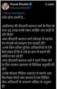 रायपुर। छत्तीसगढ़ के चर्चित आरटीआई एक्टिविस्ट कुणाल शुक्ला ने सोशल मीडिया प्लेटफॉर्म ट्विटर पर डीएसपी कल्पना वर्मा को लेकर कई संवेदनशील सवाल उठाए हैं। उनके इन दावों ने पुलिस विभाग और प्रशासनिक तंत्र में हलचल मचा दी है।