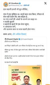 बघेल के इस कटाक्ष पर वित्त मंत्री ओपी चौधरी ने भी कहानी के अंदाज़ में पलटवार किया। चौधरी ने अपनी पोस्ट में एक गांव और उसके मुखिया का उदाहरण देते हुए आरोप लगाया कि पिछली सरकार के दौरान खजाना खाली कर दिया गया था। उन्होंने कहा कि वर्षों तक शासन करने वाले पुराने “मुखिया” ने सड़कों, अस्पतालों और जनकल्याण योजनाओं की दुर्दशा कर दी। जब सरकार बदली तो खजाने में “पत्थर ही बचे”। ऐसे में चौधरी ने तंज कसते हुए लिखा कि “जिन्होंने खजाना खाली किया, वही अब सबसे ज्यादा शोर मचा रहे हैं कि लूट हो गई।”