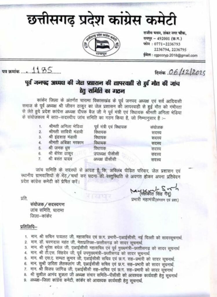 रायपुर। पूर्व जनपद पंचायत अध्यक्ष और सर्व आदिवासी समाज के पूर्व जिला अध्यक्ष जीवन ठाकुर की रायपुर सेंट्रल जेल में हुई संदिग्ध मौत ने बड़ा विवाद खड़ा कर दिया है। घटना को गंभीर मानते हुए कांग्रेस ने 7 सदस्यीय उच्च स्तरीय जांच समिति गठित की है। कांग्रेस का आरोप है कि जेल प्रशासन की गंभीर लापरवाही के कारण जीवन ठाकुर की मौत हुई, इसलिए विस्तृत एवं निष्पक्ष जांच बेहद आवश्यक है।