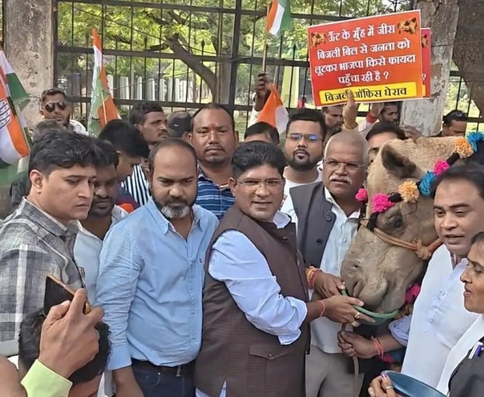 बिजली बिल हॉफ योजना पर कांग्रेस का अनोखा प्रदर्शन: ऊंट को जीरा खिलाकर सरकार के फैसले का विरोध